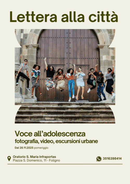 Tra le azioni più significative spicca “Voce all’adolescenza”, che si svolgerà all’oratorio di Santa Maria Infraportas, nel cuore del centro storico di Foligno. Uno spazio simbolico, scelto proprio perché la zona presenta fragilità sociali e mancanza di luoghi di aggregazione giovanile: riportare qui un percorso educativo significa riaccendere la vita comunitaria e restituire ai ragazzi la possibilità di vivere liberamente uno spazio pubblico. Ogni mercoledì pomeriggio, per un totale di 30 ore gratuite, gli adolescenti tra i 14 e i 17 anni, accompagnati dagli educatori e dagli esperti della Cooperativa Densa, esploreranno la città attraverso fotografie, narrazione, strumenti audiovisivi, passeggiate e momenti di osservazione sul campo. Il loro compito sarà quello di analizzare spazi, relazioni, bisogni, immaginare l’uso degli spazi pubblici e proporre idee per una Foligno più adatta alle generazioni future. Parallelamente, altri percorsi coinvolgeranno anche i più piccoli e gli insegnanti, con laboratori nelle scuole, attività di comunicazione per studenti dell’Istituto Tecnico “Scarpellini” in collaborazione con Radio Gente Umbra e la Gazzetta di Foligno e un gruppo di giovani comunicatori incaricati di diffondere la voce del progetto.
